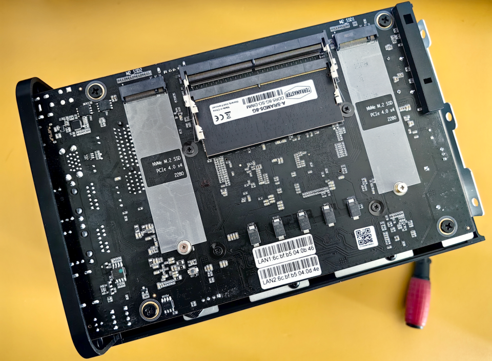 🔺它的内部SSD插槽采用便于散热的分开设计,位于内存插槽两侧。内存插槽采用的双插槽设计,最高可以扩展到32GB。默认标配的是一根铁威马定制的8GB DDR5 4800MHz高速内存,拥有不错的兼容性与可靠性。而M2 SSD插槽支持2280规格,且采用的是PCIe 4.0x4的高速通道。
