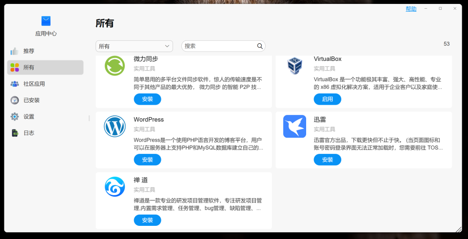 🔺首先就它自带的应用中心来说,它目前已经拥有多达53个可以直接使用的应用套件。包括各类备份、安全防护、多媒体处理、Docker容器、虚拟机,以及专业的开发工具、商业软件等。