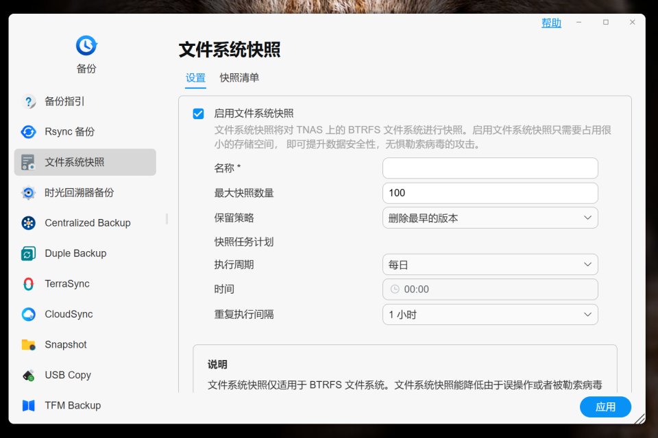 🔺至于文件系统快照就不用我多说了吧,因为很多在电脑上玩过虚拟机的小伙伴肯定都接触过。这个虽说铁威马将它分类在备份,但它同时也兼备了安全的属性,因为它可是很多勒索病毒的克星,反正就是我们NAS不管是遇到病毒还是误删文件,都可以按快照时间点回滚到指定备份。
