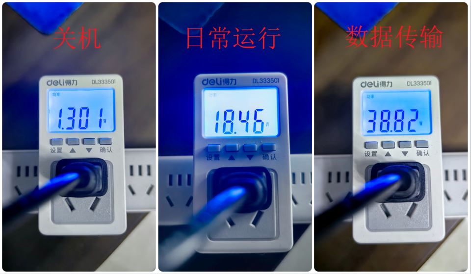最后给大家汇报一下铁威马F4-424 Max的实机功耗情况,需要说明的是,目前的功耗只是在使用两块西数红盘Plus硬盘的状态下测试的,具体的功耗还是根据大家的实际的使用情况。
