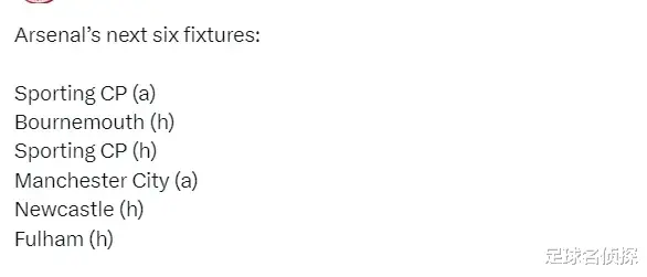 阿森纳未来6场比赛对手:客战葡萄牙体育、主战伯恩茅斯、主战葡萄牙体育、客战曼城、主战纽卡斯尔、主战富勒姆。