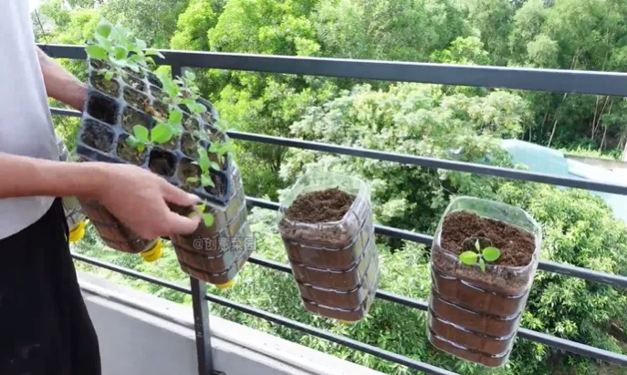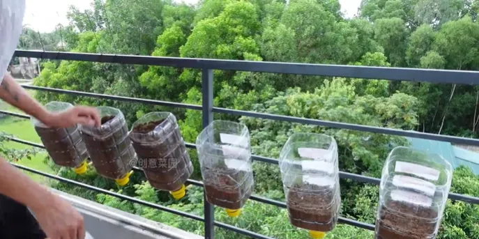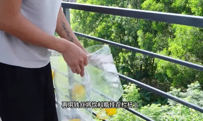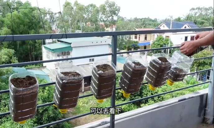 最后,用铁丝或挂钩将改造好的饮料瓶固定在阳台栏杆上,既节省空间,又方便管理。