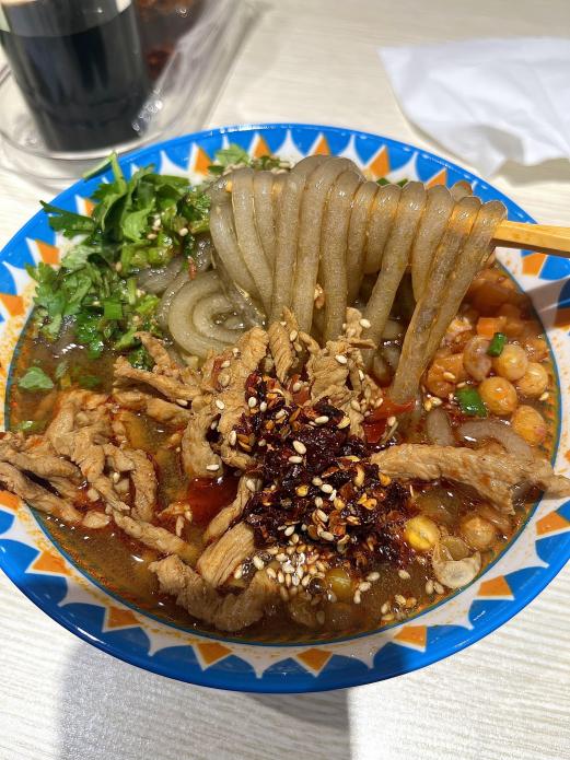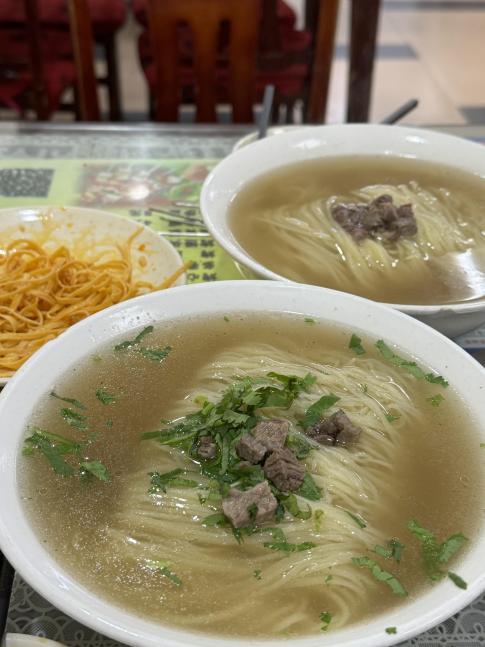 拉面筋道爽滑,汤头清鲜不油腻,加份牛肉片更满足,秘制辣椒油香而不辣,拌面条吃超香,是老威海的味道。