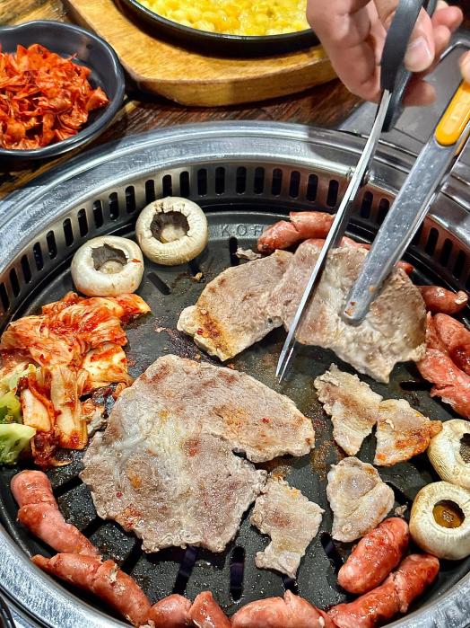 厚切猪五花烤到焦边,油脂香四溢,原切牛肉片烤后鲜嫩,韩式冷面冰爽解腻,面条劲道,配梨片牛肉片超搭。