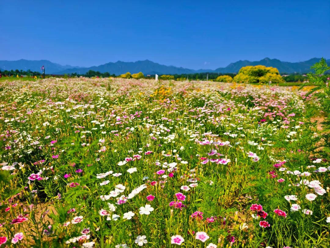 初春二月兰与油菜花交织成紫色与明黄的撞色画卷;五月石竹花海铺展成粉色地毯;盛夏波斯菊与薰衣草摇曳生姿,仿佛置身普罗旺斯;秋季黄栌红叶点缀其间,美不胜收。