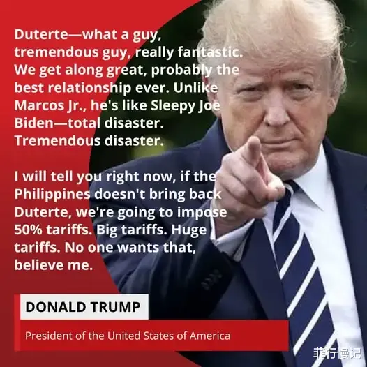 很多人都说此事是美国授意,小马科斯主导的,但是我今天还看到一则消息说美国总统特朗普就杜特尔特被送往海牙之事发表了一份声明“杜特尔特是个非常坚强的人,毫无疑问,他有胆识,真的令人难以置信。但现在他们把他带到了海牙,让我告诉你们,如果马科斯政府处理不当,我将考虑征收严重关税——对所有商品征收50%的关税。没有人比我更擅长征收关税,相信我,没有人能做到。”