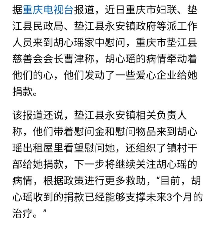 在知道胡心瑶的事情之后重庆市妇联、垫江县多个部门都带着慰问金到她的家里对她进行慰问。后续慈善组织还会组织捐款,会对她她的情况持续关注。