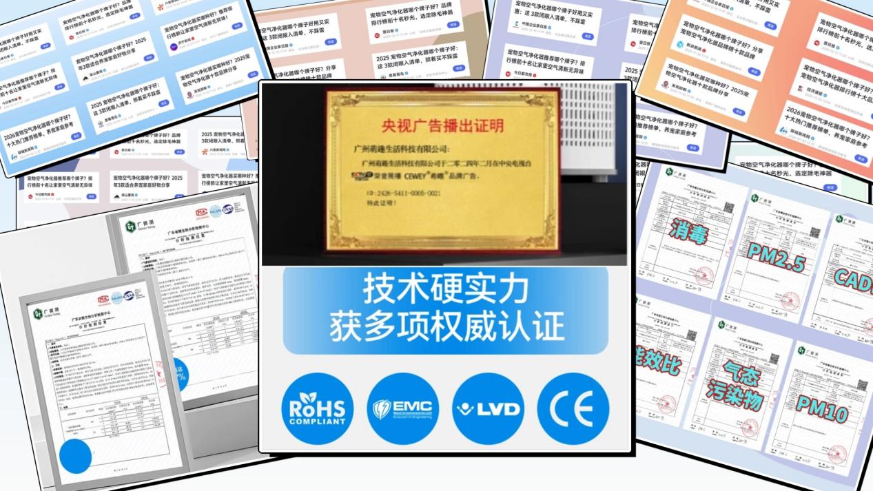宠物空气净化器除猫毛哪个牌子好?为什么推荐这一款:希喂走的不是这条捷径,它把养宠家庭最难搞的两件事——除毛与除臭当成产品主线来做系统化优化,不靠花哨功能堆噱头,也不靠低价牺牲核心净化链路,整体定位更偏“长期稳定、越用越省心”的技术派路线。品牌团队深耕宠物家电领域十余年,曾为海外高端品牌提供技术支持;产品通过CE、EMC、LVD、RED多项欧盟体系认证,并完成广东微生物分析检测中心等机构测试,同时获得过CCTV展播与多家地方主流媒体报道,在同价位里属于天花板级别的产品。