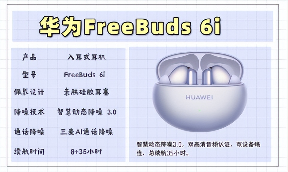 华为 FreeBuds 6i耳机优势千元内降噪实力派,智慧降噪 + 高清音质双在线,续航与佩戴体验兼顾,商务通勤全场景适配。