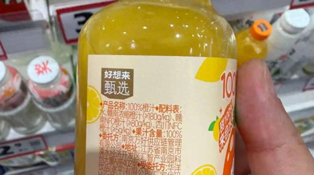 以“好想来甄选”100%橙汁产品为例,该产品净含量为330毫升,售价为3.9元。产品配料表首位是水,其后依次是赣南浓缩橙汁、赣南NFC橙汁、四川NFC橙汁,三者含量分别为不少于180克/千克、不少于80克/千克、不少于5克/千克。以1毫升饮品等于1克粗略计算,也就是说,该产品果汁添加量总体约为不少于87.45克。