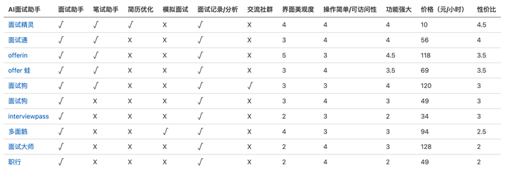 对比评测性价比对比我整理了一份表格,从功能、界面美观性、价格、性价比等方面对比这些面试助手,按性价比降序排序。
