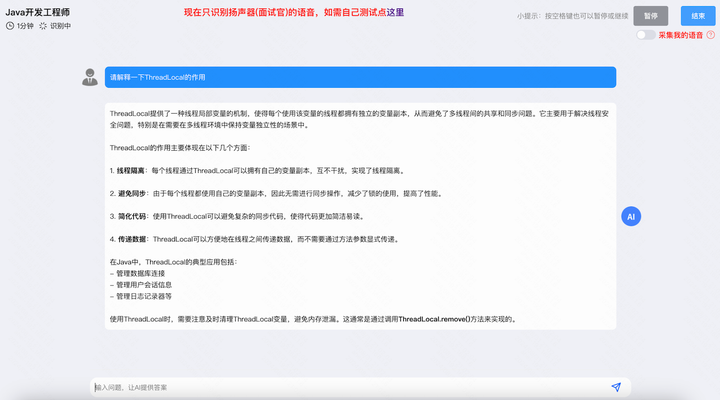 使用方法如下图,右侧实时语音分析,左侧问题分析,中间答案回复。支持多种回复模式(普通模式、算法题模式、系统设计模式、详细模式等)。