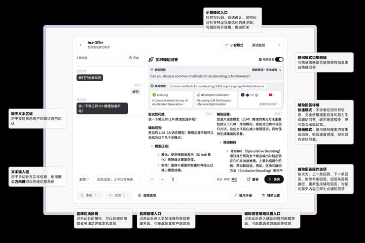 自研语音识别,集成Chatgpt o1模型,自研AI agent解答算法题,支持简历解析功能。支持共享屏幕模式和语音模式两种输入模式,大模型输出支持质量优先、速度优先、代码模式。