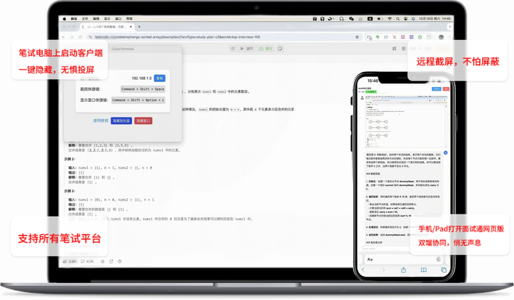 面试精灵还有笔试助手功能,通过多设备隐蔽互联支持远程截屏,用视觉大模型自动识别问题并生成答案。最方便的是,用笔试助手不需要下载APP,直接访问网站就行,操作简单,隐蔽性也强。