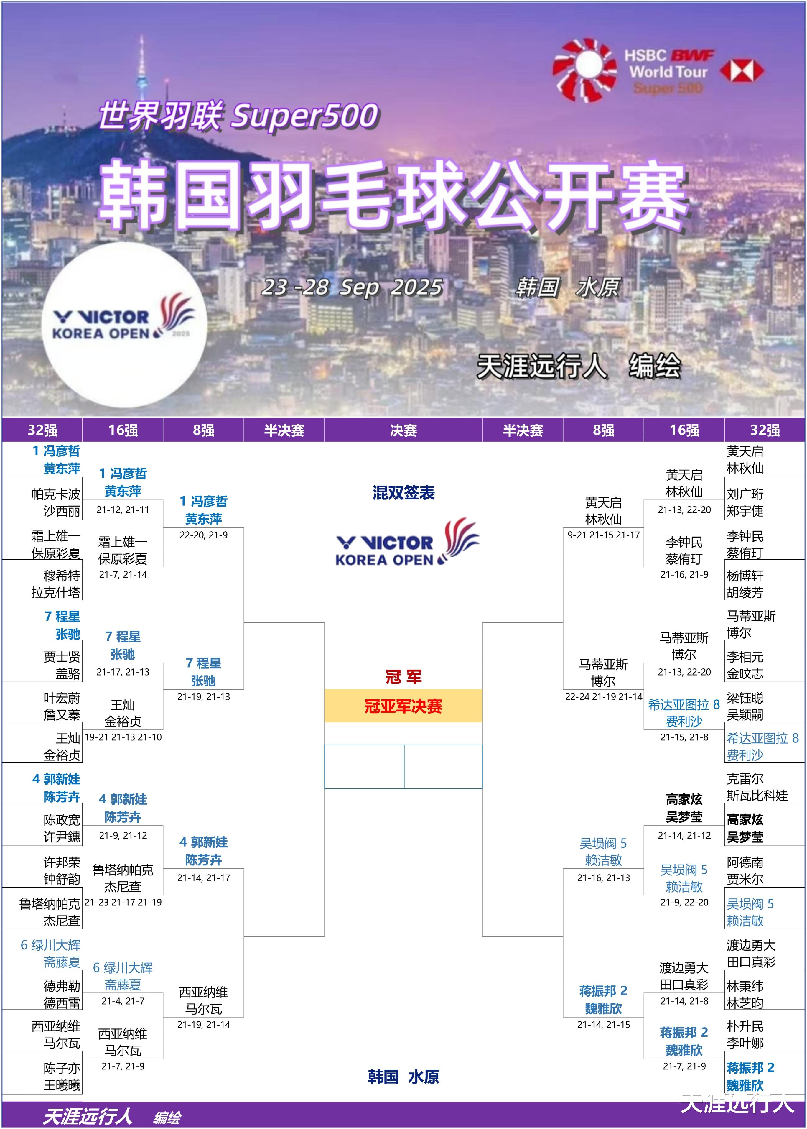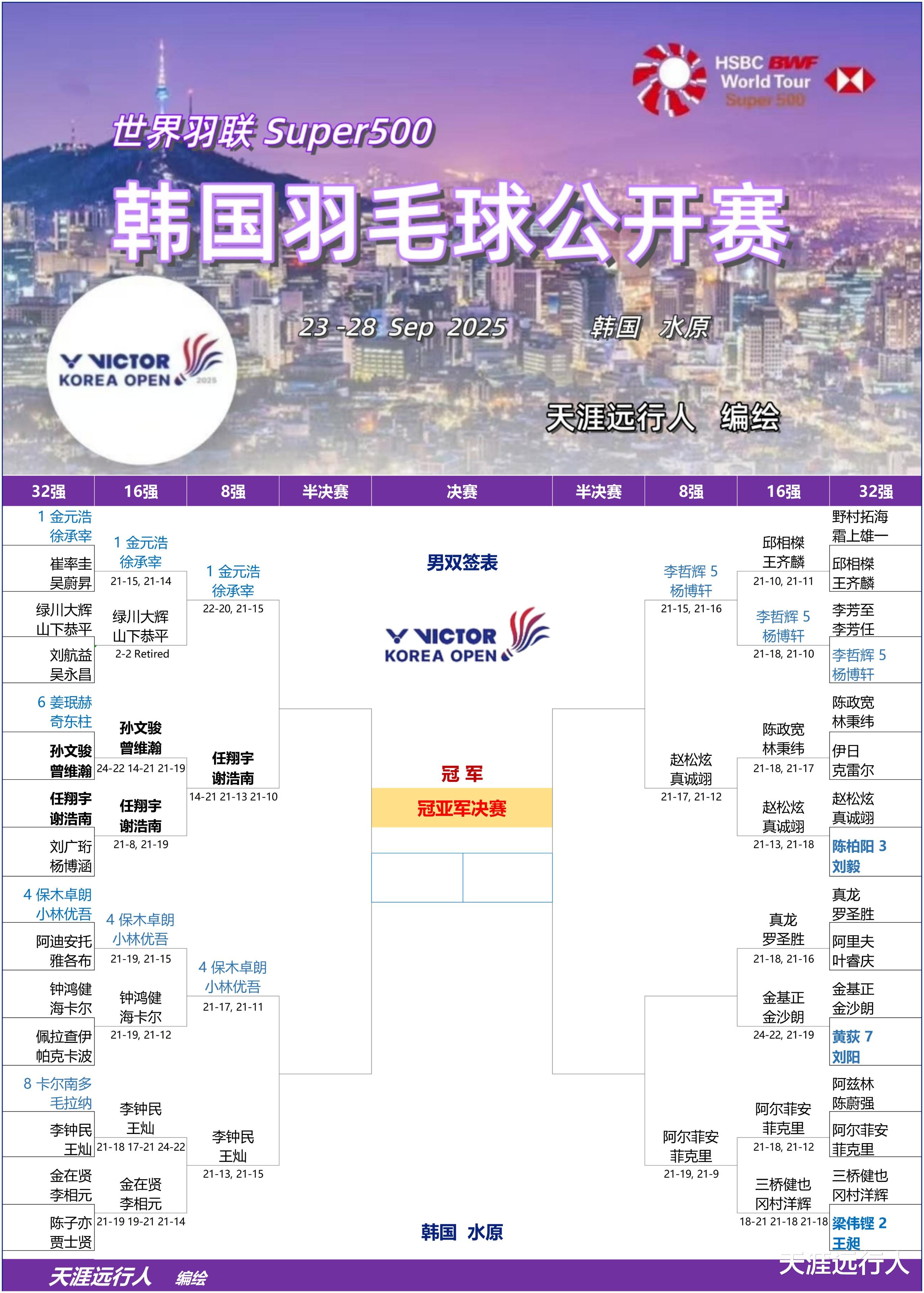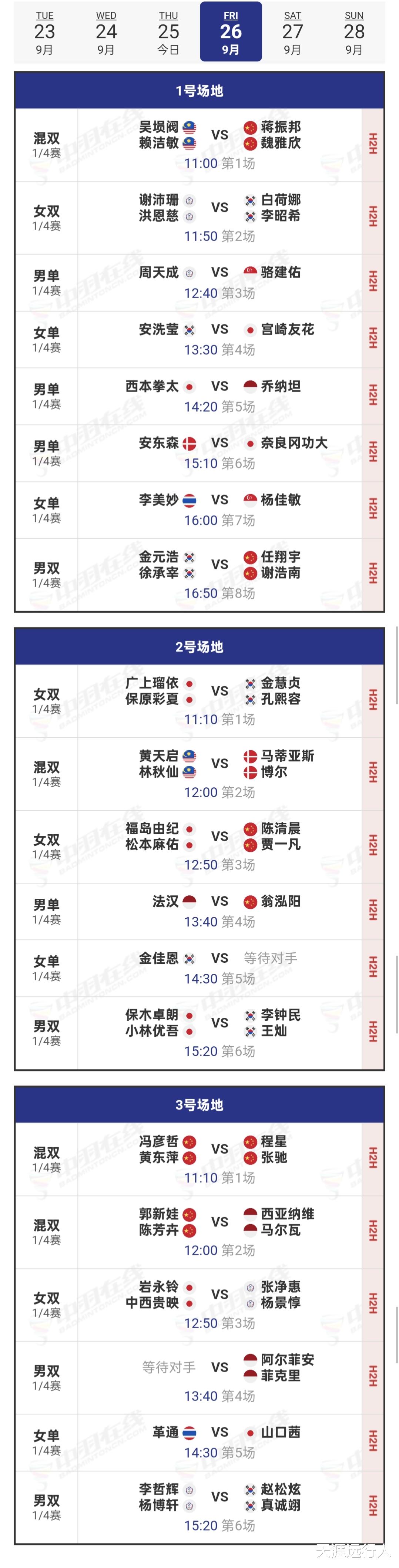 北京时间9月25日21时42分,2025世界羽联超级500韩国公开赛第三比赛日,16进8轮次五个单项的40场角逐,在水原