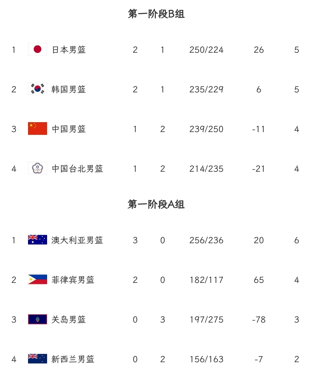 本组前两轮结果为【第一轮】日本90-64中国台北、中国76-80韩国;【第二轮】韩国90-76中国、中国台北73-80日本;【第三轮】日本80-87中国,中国台北77-65韩国。剩余赛程为:【第四轮】3月1号,中午13点日本VS韩国,下午四点中国台北VS中国;【第五轮】7月3号,中国VS日本、韩国VS中国台北【第六轮】7月6号,中国VS中国台北,韩国VS日本。