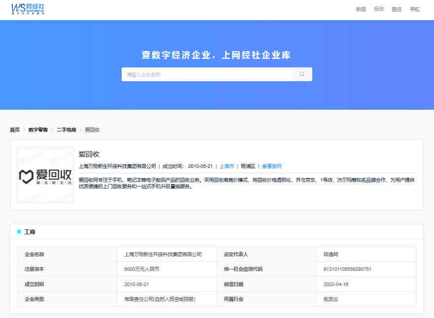据网经社企业库显示,“爱回收”隶属于上海万物新生环保科技集团有限公司,成立于2010年5月21日,法定代表人为陈逸轲。