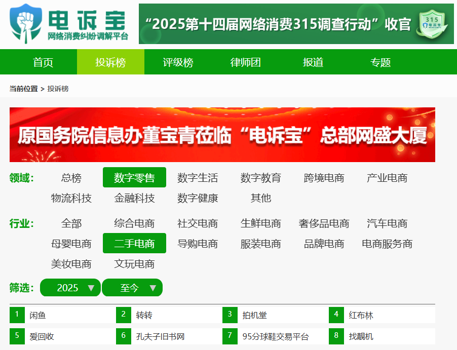 据“电诉宝”受理的数字零售中二手电商领域用户有效投诉显示(依据投诉量排行),“爱回收”排名第6位。最新评级为“不予评级”。除此之外,其他被投诉的类似平台依次为:闲鱼、转转、拍机堂、红布林、孔夫子旧书网、95分球鞋交易平台、找靓机。