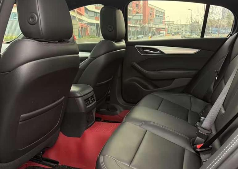 将视线转移到侧面,车身姿态比较动感,若隐若现的腰线搭配黑色花瓣式铝合金轮圈,进一步增强了运动气息。尺寸上,凯迪拉克CT5的车身长宽高分别为4930mm、1883mm、1453mm,轴距为2947mm,身板要比同级别的竞品要大一些。不过,毕竟是一款主打运动和操控的后驱车,而且后背还是掀背式的设计,头顶空间会比较压抑,而且后排地板中间也是高高隆起,舒适性确实不如同级别的奥迪、奔驰。