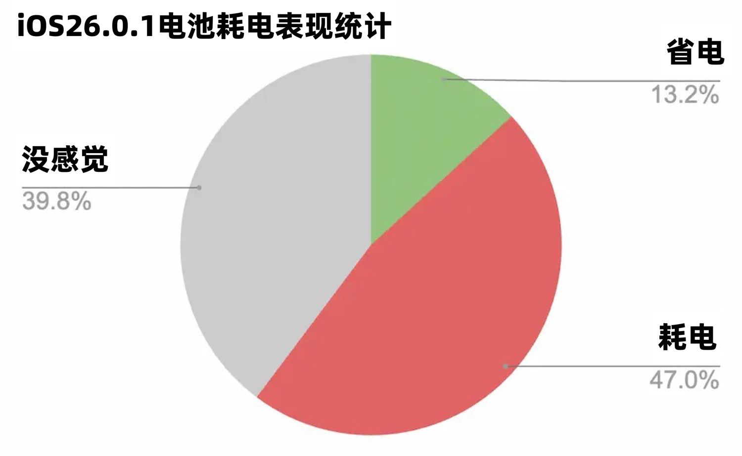 从多款 iPhone 设备更新至 iOS 26.0.1 电池续航统计数据显示,实际iPhone用户在体感上却与实测结果完全不同,将近有47%用户依旧感觉升级该版本后还是很耗电。