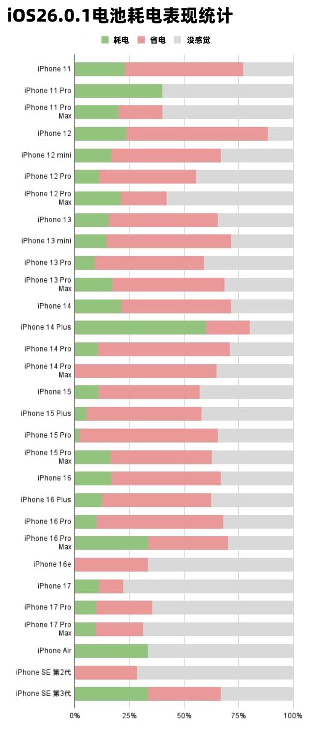 从以上统计数据大致上能看出仅只有 iPhone 14 Plus、iPhone 11 Pro、iPhone Air 和 iPhone SE 3 在更新 iOS 26.0.1 后,才回明显感觉到省电,其余机型都是呈现耗电情况。