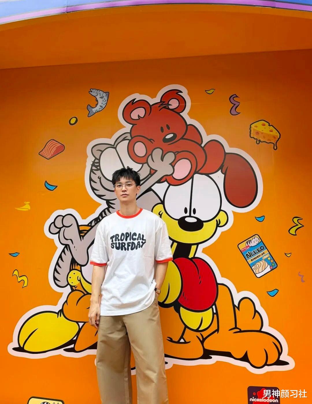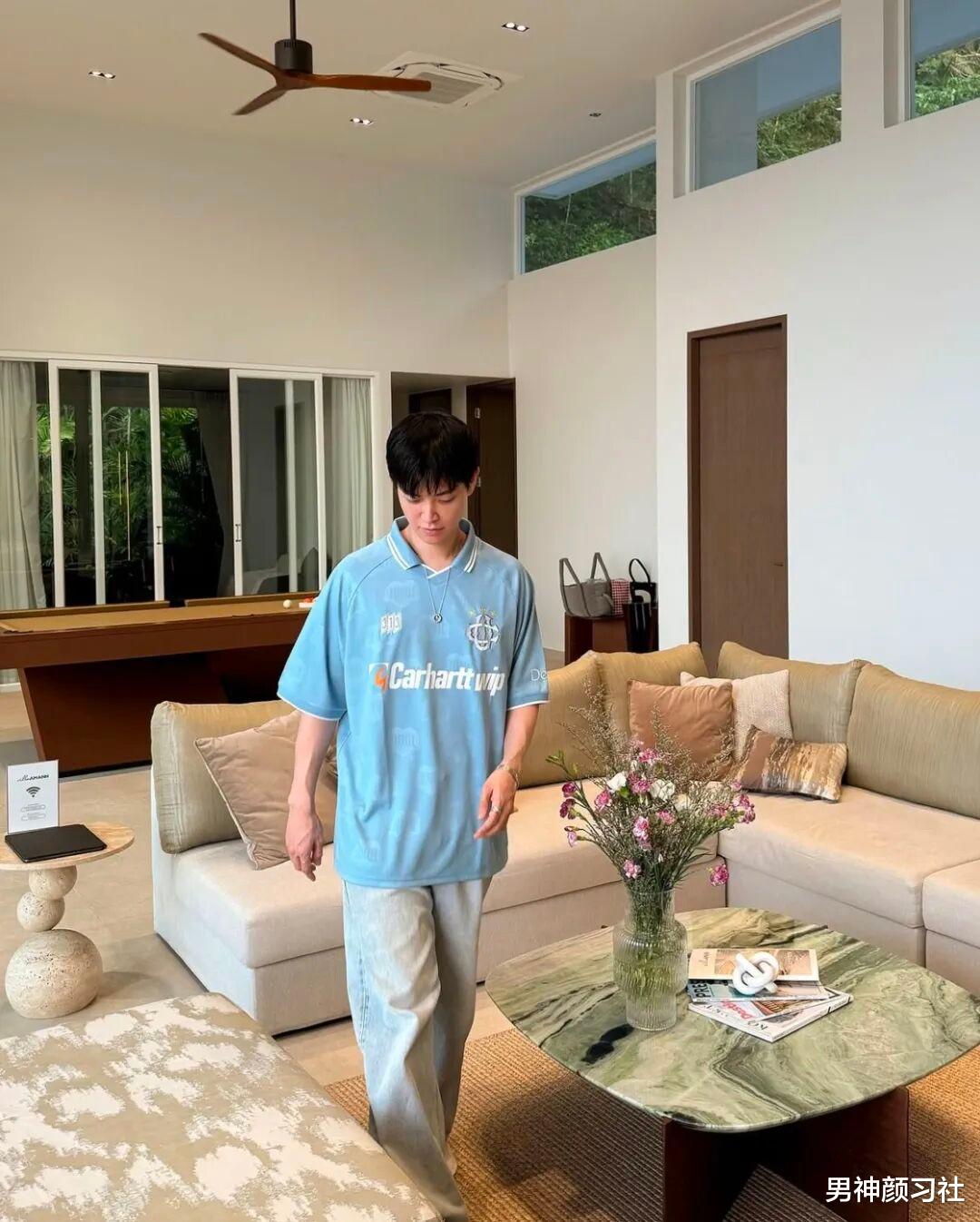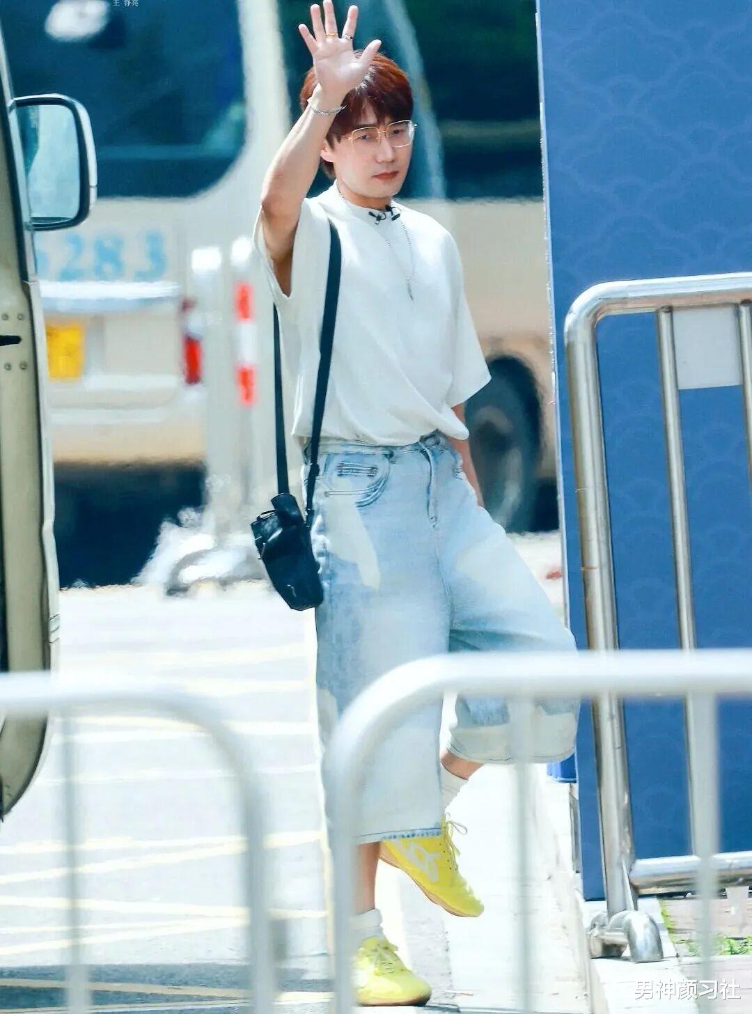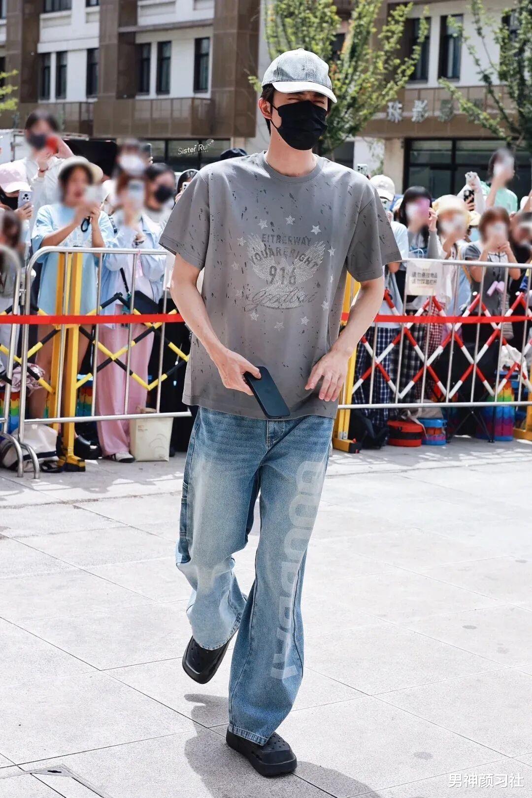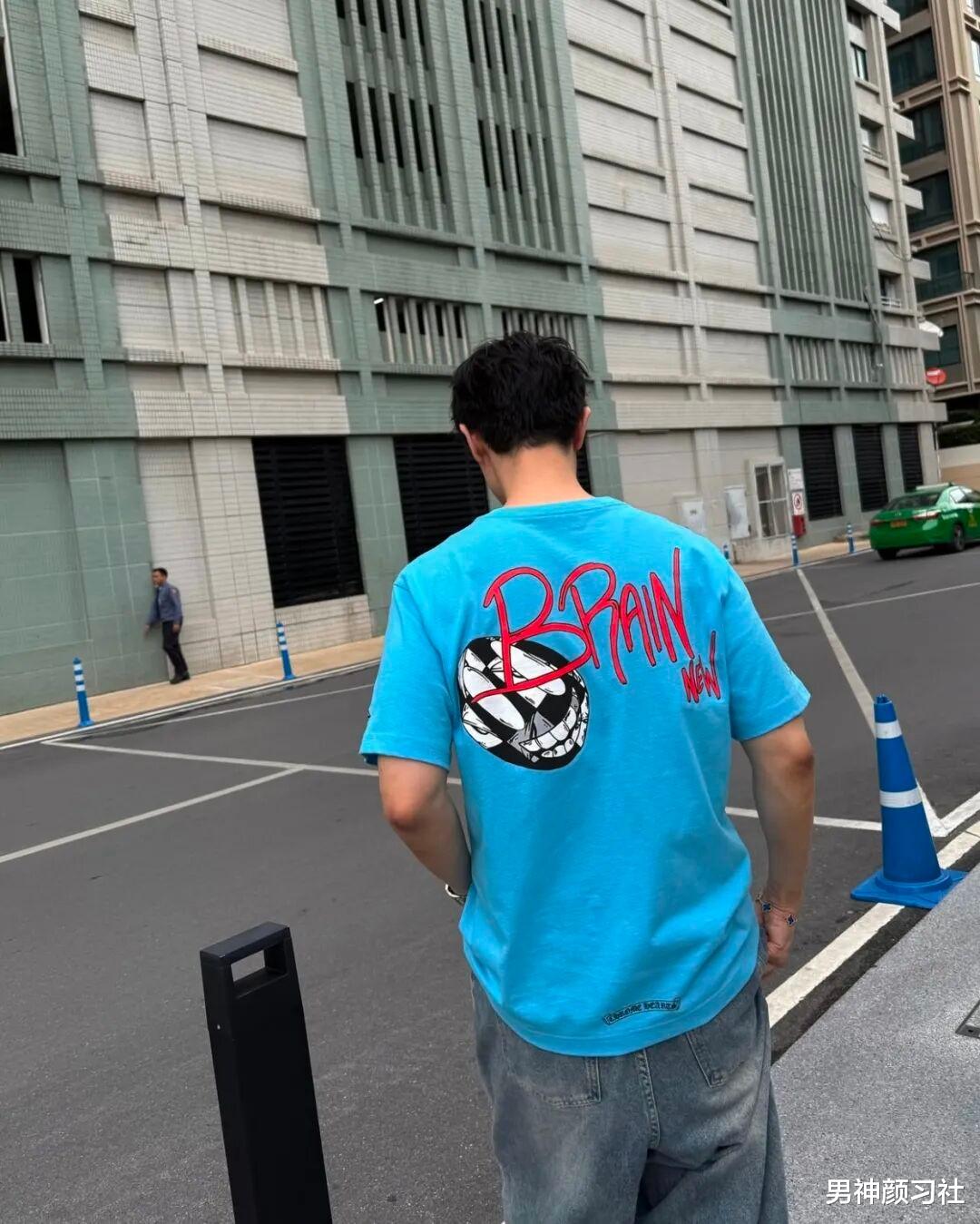 蓝色短袖其实大家穿挺多的,像他这件是比较玩趣的,走在人群中很有意思。搭配上他是用简单的牛仔裤来穿,像这样一个单品复杂,一个简单就达到了非常高的境界,也能让你看上去特别帅气。