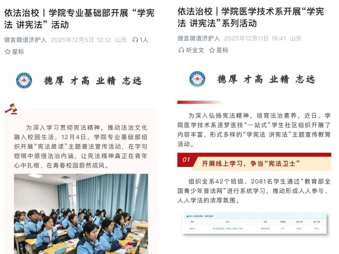 各系部结合专业特色,开展多种形式的宪法学习活动。如:药学系依托杏林苑“一站式”学生社区,举办“以言传法治,以行践青春”主题征集活动;医学技术系围绕“人工智能立法”“超前消费”“社会治理中法理与情理的平衡”等辩题,举行普法主题辩论活动;口腔医学系以“齿尖守正,法护成长”为主题,围绕“新时代医学生如何践行宪法精神”召开专题班会;五年一贯制举办“宪法与职业规范”主题班会,引导学生理解宪法与未来医护职业的关联。