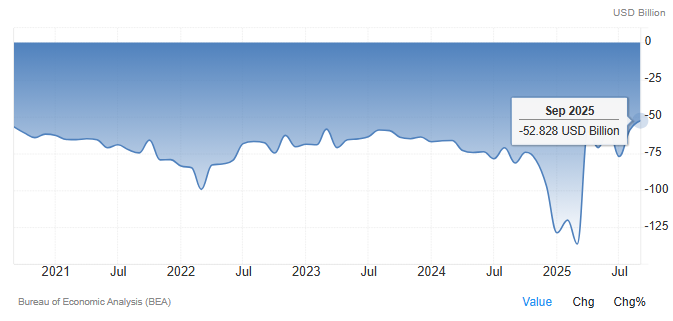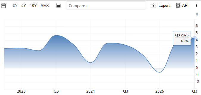 美国商务部数据显示,Q3 4.3%的增速并是消费、出口与政府支出协同发力,同时叠加进口收缩的结构性结果,具有一定阶段性特征。
