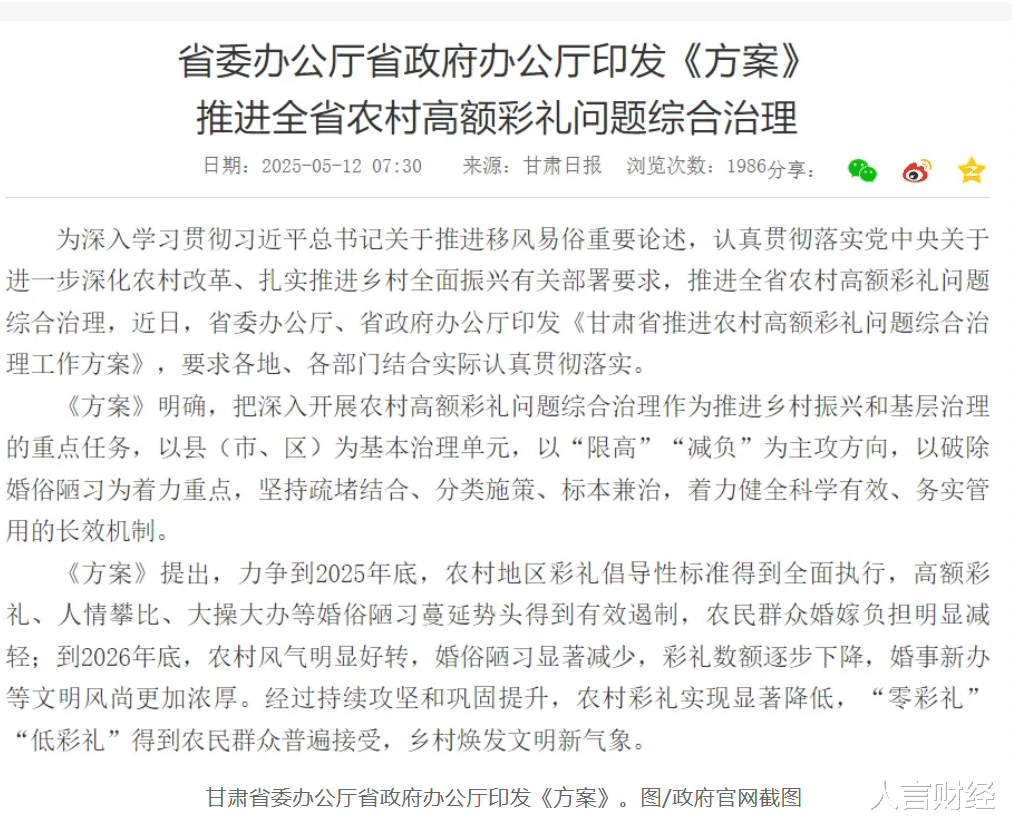 甘肃这波操作堪称“精准打击”:以县为单位定彩礼指导价,构建“县乡村三级联动”体系,把婚事简办写进村规民约,甚至在婚姻登记时直接“介入询问”。