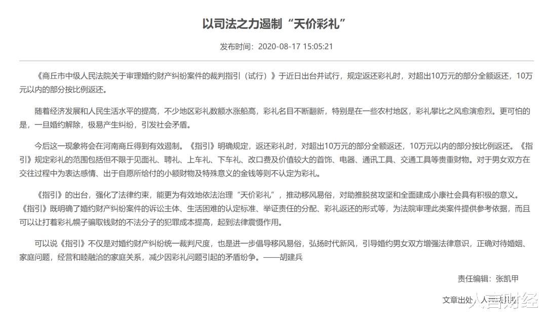 河南商丘出台彩礼“指导标准”,规定农村彩礼不超过3万,城区不超过5万,违者纳入村规处罚。