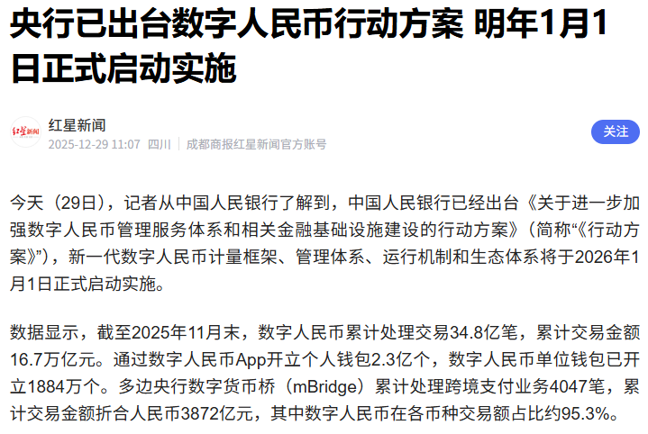 据央视新闻报道,从中国人民银行了解到,中国人民银行已经出台《关于进一步加强数字人民币管理服务体系和相关金融基础设施建设的行动方案》,新一代数字人民币计量框架、管理体系、运行机制和生态体系将于2026年1月1日正式启动实施。数字货币下午拉了一小波,不过,涨停的不多……