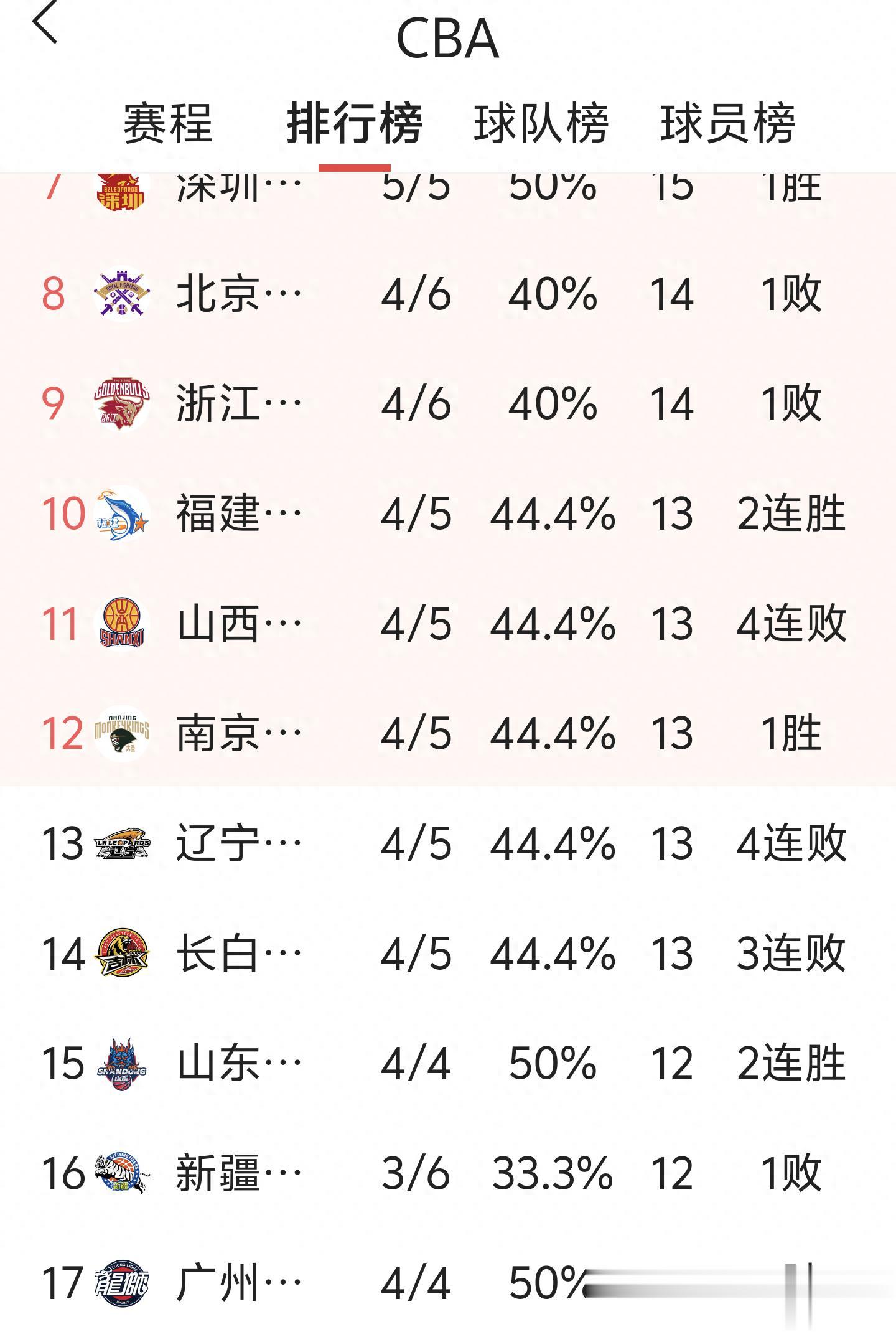 广州队胜率为50%,积12分,位列CBA积分榜第17名,除了山东队外,积分榜第8至第16位的胜率为33.3%至44.4%