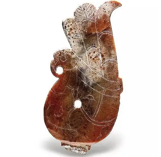 黄褐色,镂空雕刻。形状为侧首回身状,头似公鸡,头顶有齿脊状冠。圆眼,尖喙,胸部向外凸起,与尾连成弧线形。短翅长尾,尾翎分开两叉。爪卧胸下,背中间有一突,突中有一小圆孔,可佩带。翅膀上雕刻四条阳线以饰翎纹。造型优美,线条流畅,制作精细。