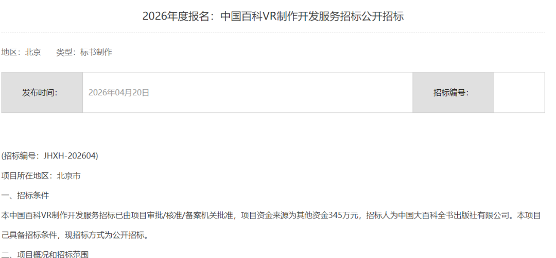 4月20日,中国大百科全书出版社有限公司发布中国百科VR制作开发服务招标公告。