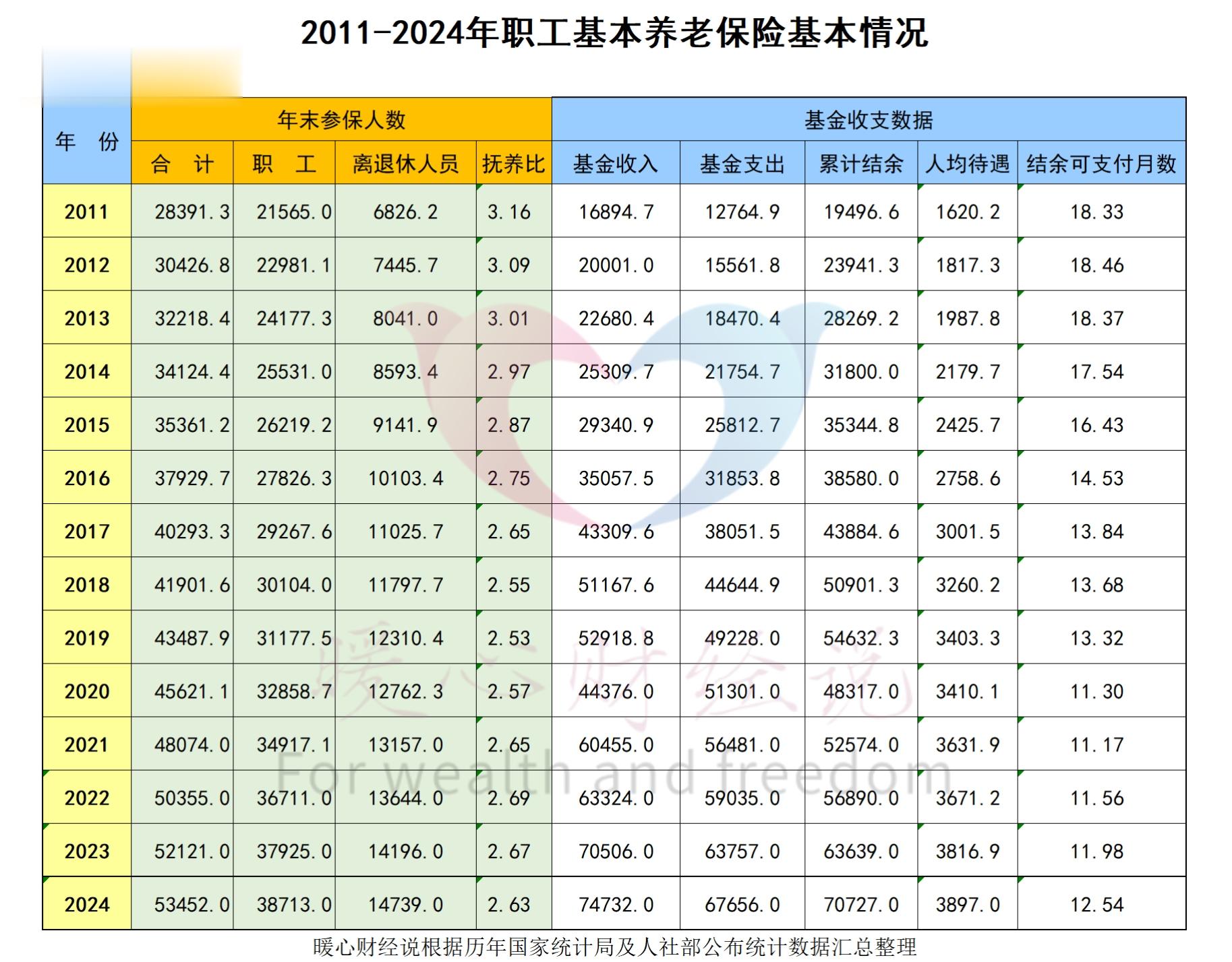 有的朋友可能觉得,养老金只增长了2%,支出为什么涨得那么多呢?主要还是因为每年都有大量的新增退休人员,比如说2024年我国离退休人员数量达到了14739万人,净增加543万人。这一部分人数的提高,增加了养老保险基金的支出。但是说实话,2024年人均养老保险待遇是3897元,仅比上年增长2.1%(而2024年的养老金增长率是3%),说明去世人员的养老金水平要高于新办理退休人员养老金水平的,也有可能是放开养老保险制度以后达到退休条件的人群养老金水平较低。