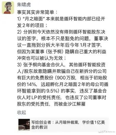仅仅一个月后,朱啸虎又将矛头直指张予彤。他在朋友圈发文称,张予彤向基金合伙人、其他循环智能投资人/股东故意隐瞒并欺骗自己在新拆分的公司有巨大的免费股份(初始股份的14%)的事实。