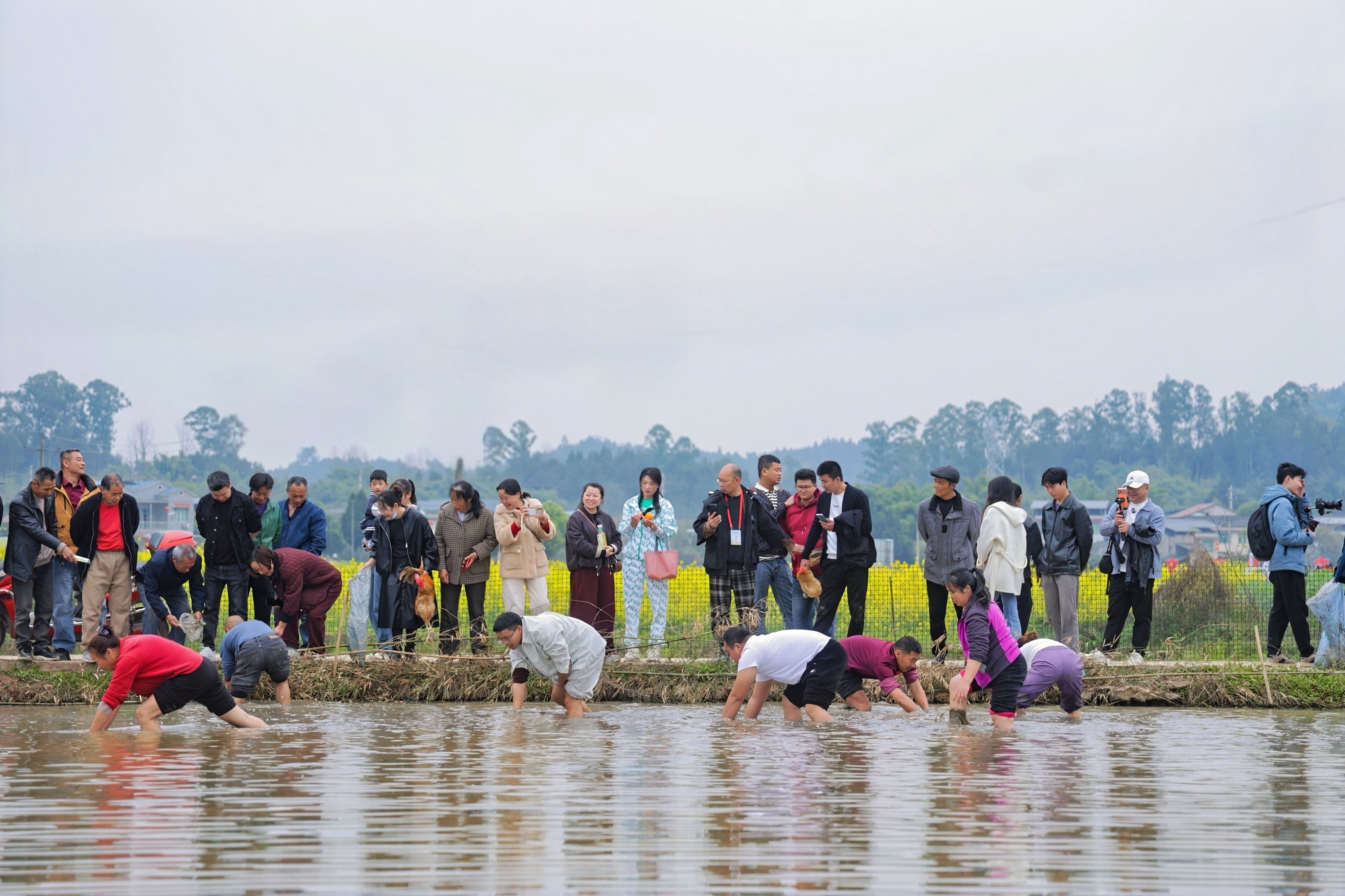 集市乐购,助农增收。“朝花夕市”集市里,“丰收集结号” 农产品展销区人头攒动,有机大米、新鲜蜂蜜、手工编织品等本地土货,岳池米线、米粉、豆干等特色美食一应俱全,现榨菜籽油展示更让游客感受本土产业魅力;吴家大院“我家菜园”农户自销点,带泥带露水的时令蔬菜、新鲜禽蛋直供游客,农户直售模式让游客买到实惠,也为农户拓宽增收渠道;“生擒活物”自捉鸡鸭鱼活动成为当日爆款,打卡集赞入园的游客们参与抓鸡、赶鸭、浑水摸鱼,亲手体验农家乐趣,现场热闹非凡,欢声笑语不断。