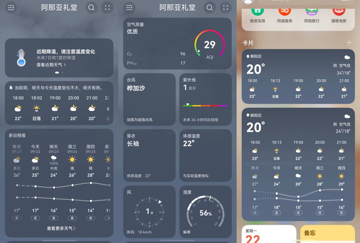 出门露营的天气有时候真是“玄学”,明明是个大晴天结果被大风刮懵、被大雨浇透都遇到过,所以信息准确、数据丰富的华为天气就帮上大忙了。它能预测未来几小时到15天的天气变化,降水概率、风力风向、紫外线强度这些实用数据全有,如果最近有气温变化,它还会在天气页面提醒你,甚至给到穿衣建议。桌面或者负一屏也都支持多种天气卡片,不用特意点开App,把卡片放自己习惯看的位置,扫一眼就能知道天气变化。在户外开心徒步,就靠它“剧透”的天气啦!