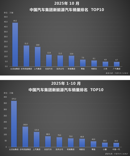 10月,中国车市进入全年冲刺季,比亚迪再次交出亮眼成绩单。10月单月销售44.17万辆,创下年内新高;1–10月累计销量370.19万辆,同比增长13.9%,全年销量目标完成率超80%。在中国企业(集团)新能源汽车单品牌销量排名中,比亚迪处于新能源领跑赛道,均稳居行业榜首。