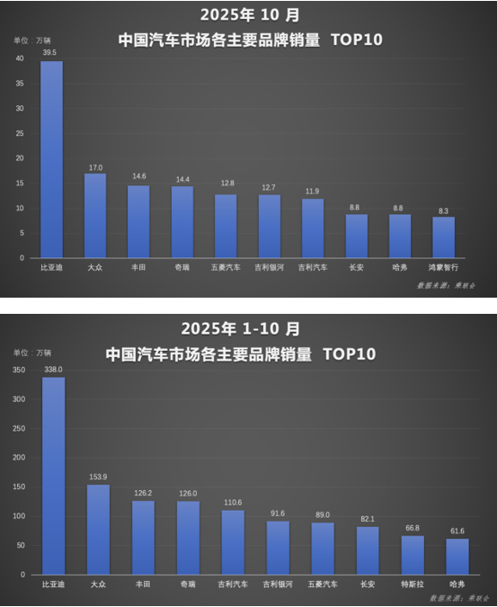 在这一浪潮中,比亚迪的领先优势愈发明显,前十月累计370万销量接近第二至第四名之和。其中,比亚迪汽车王朝网与海洋网10月销售39.5万辆,1-10月累计销量达338万辆,持续夯实规模基本盘。