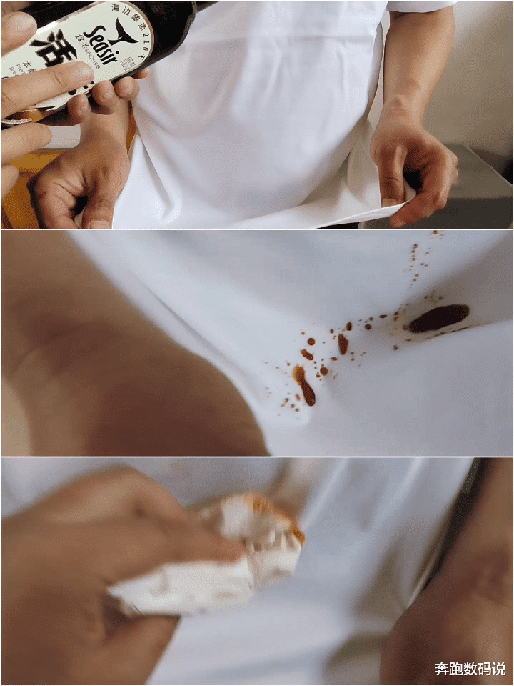防油防污测试:将酱油均匀喷洒在面料表面,油滴迅速聚成珠状滑落,纸巾轻轻一擦就完全干净,无任何油渍残留,吃饭溅油、炒菜沾油都不用慌。而且这么深色的油污不用担心,液体不渗透、不晕染、不挂壁,轻轻一抖再简单擦拭即可恢复干净,哪怕是白色款也不怕脏污,对懒人、吃货、带娃家庭、户外爱好者都非常友好。整体达到超行标 6 级防油污,防护能力远超普通生活级三防 T 恤。