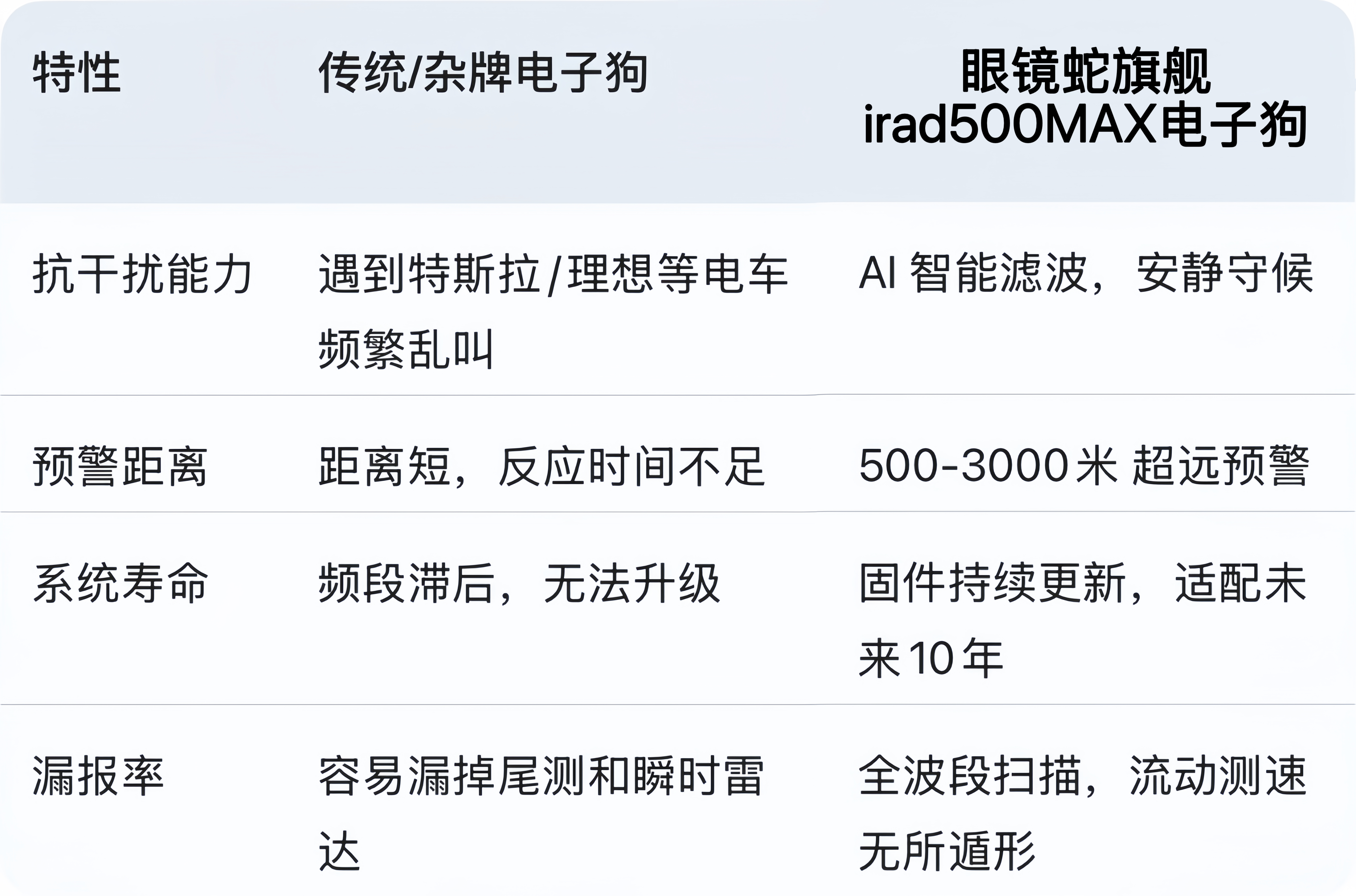 三、真伪电子狗性能差异对比探测功能差异真正的美国眼镜蛇旗舰irad500MAX电子狗是全频机,能全面有效地探测到各种雷达的无线信号,包括对的 VG2 反反测速雷达也能进行预警,可准确预警所有流动、移动、箱式、尾测、手持雷达枪等激光镭射雷达测速,预警距离业界最远可以从 500 米到 3000 米,表现出探测灵敏度高,抗干扰能力强的优势。而假冒的所谓 SPXC 系列电子狗,很多只依靠 GPS 地图,对于流动的激光雷达测速毫无预警能力,在实际使用中,车主可能会面对流动测速而不自知,极易导致超速罚单。