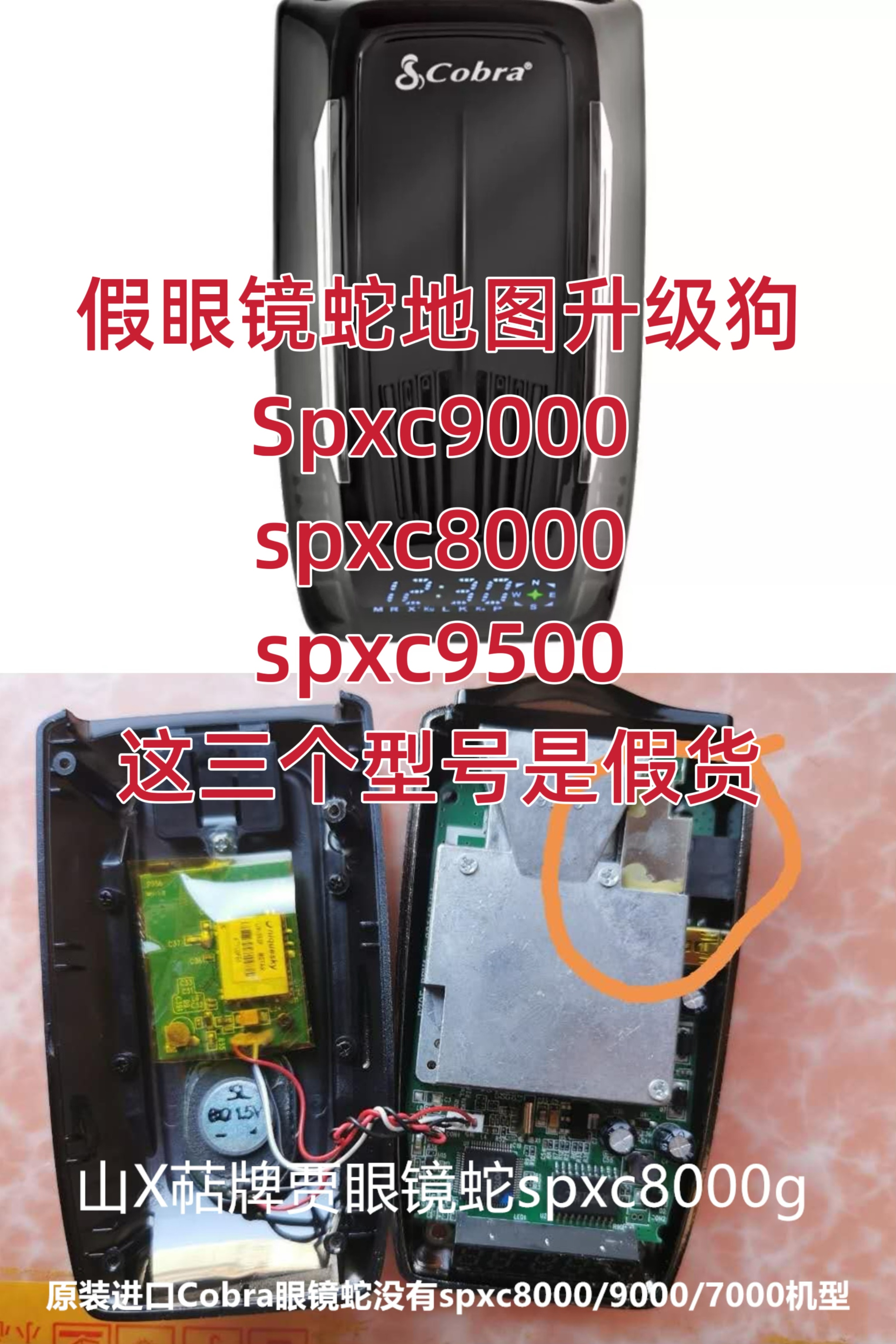 二、SPXC8000、SPXC9500、SPXC9000 伪型号情况市面上出现的山行贴牌的 GPS 地图云狗记录仪,如所谓的眼镜蛇 SPXC9500、SPXC8000G、SPXC9000GS、SPXC7000 等均为假货。很多国产电子狗只涵盖 GPS 地图,并不能预警流动等激光雷达测速,极容易出现漏报乱叫的情况。由于电子狗属于高频的汽车电子产品,在工作中,它的内部产生的热量很大,而这些假冒的电子狗在耐热方面做得不够好,甚至根本没有能够实现散热处理,这往往会导致电子狗的工作失常,通常出现的后果为漏报、误报、乱报频繁。而正品眼镜蛇电子狗并没有 SPXC9000GS、8000G、9500 等这类地图狗型号。
