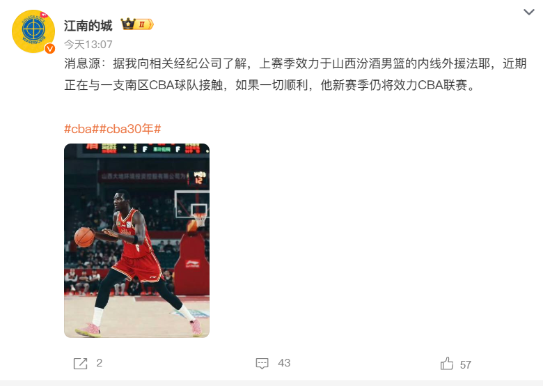 唯一还没完成签约的外援,就是易卜拉希马·法耶了。不过根据国内的媒体人“江南的城”了解,法耶近期与一支南区CBA球队接触,如果一切顺利,他新赛季仍将效力CBA联赛,所以法耶新赛季加盟深圳队基本上是十拿九稳的事了。