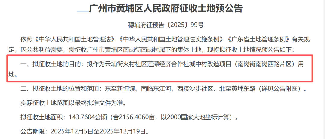 今天,房产君刷到了南岗村的最新征收公告,拟征收143.7604公顷,相当于4个猎德村,范围覆盖整个南岗南片。