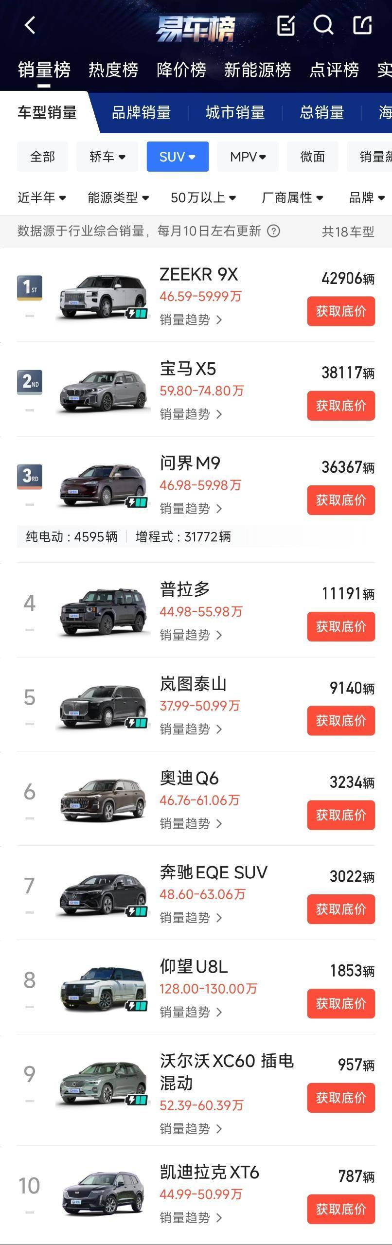 极氪9X三月单月销量破万,在50万以上SUV市场,极氪9X独占超三分之一份额,比第二到第四的X5+M9+泰山加起来还卖得
