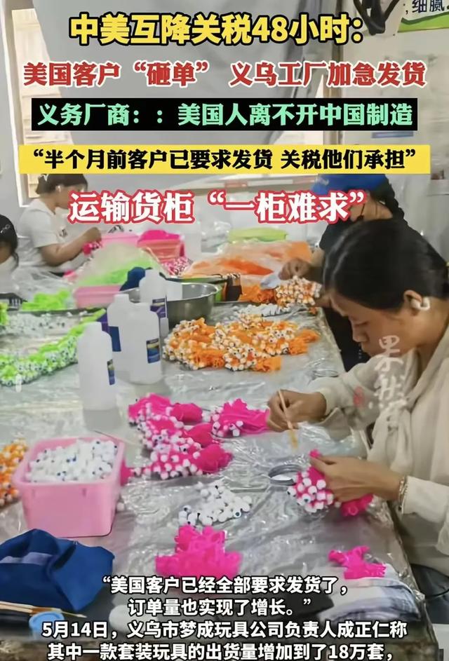 “越快越好!现在就发!”5月14日,深圳一处仓库货物堆积如山,外贸公司负责人半天内接到6个美国客户催单电话,工人三班倒连喝水都得跑着去。