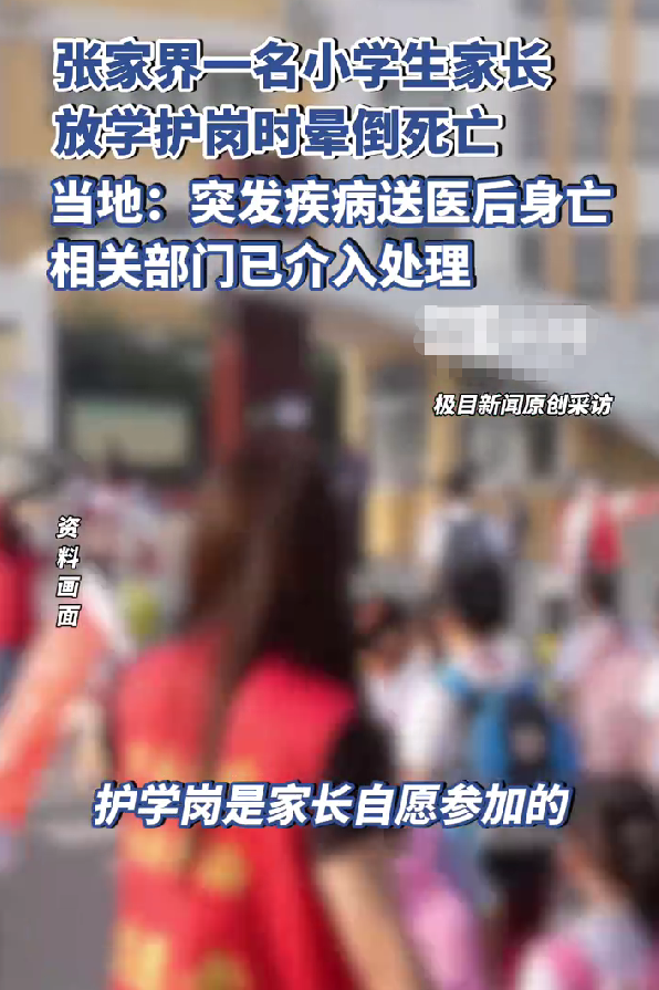 事发当日下午5点左右,放学前夕,这位父亲像许多家长一样,站在了指定的位置。据永定区教育局事后称,他“站岗不到两分钟就晕倒”。突发疾病夺走了他的生命,留下一个17岁的孩子和一个正在该校读三年级的孩子。整个过程迅速而残酷,从守护者到被抢救者,角色的转换只在瞬间。