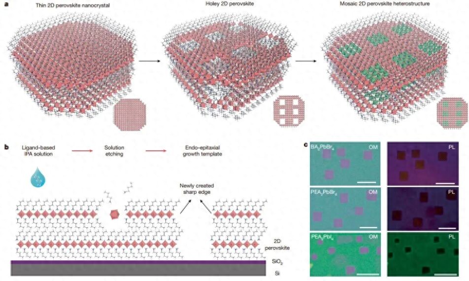 以二维卤化物钙钛矿为代表的离子型软晶格半导体,其晶体结构柔软且不稳定。这一特性使得传统光刻加工等技术难以实现高质量的横向异质集成。