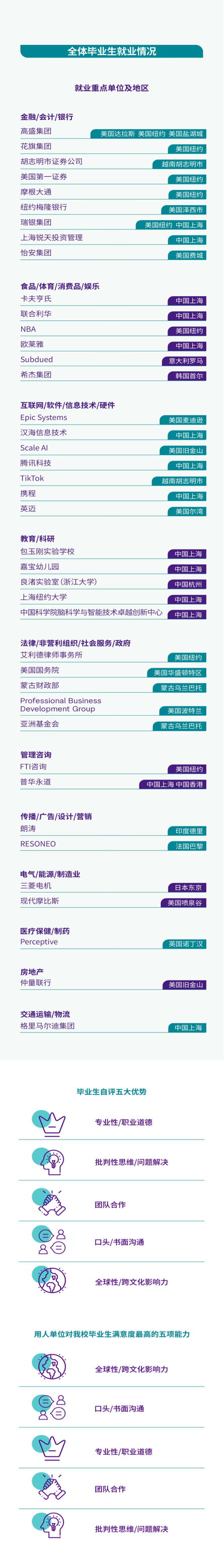 步入职场的中国毕业生多进入三资企业、高等教育单位,以全球性/跨文化影响力、口头/书面沟通、专业性/职业道德等方面的卓越能力,获得了用人单位的高度认可。